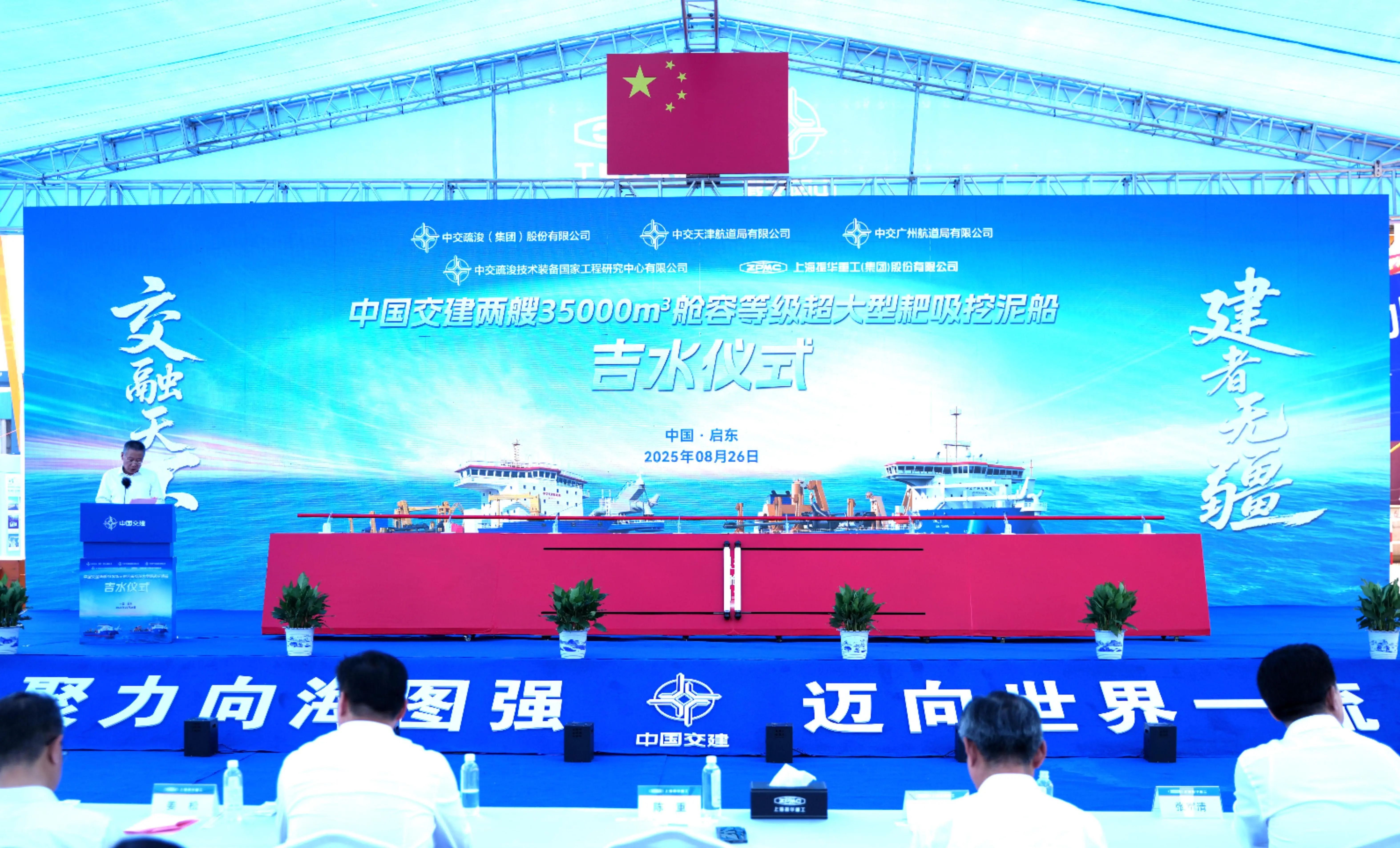 8月26日,我國自主研發設計建造的兩艘35000立方米艙容等級超大型耙吸挖泥船“通浚”輪和“浚廣”輪在江蘇啟東順利吉水。中交集團黨委常委、副總經理陳重出席吉水儀式并致辭。