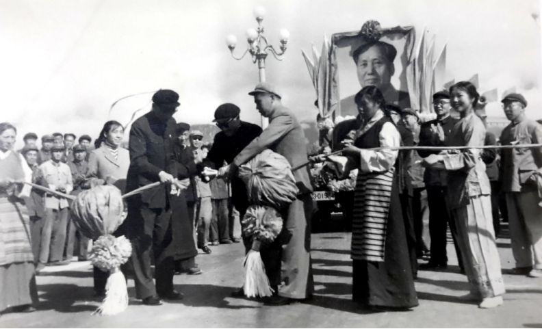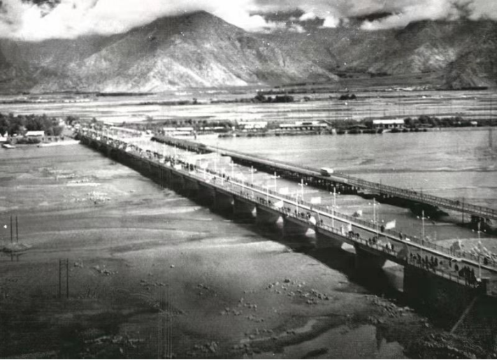 1965年8月25日,風和日暖,彩旗飄揚,原交通部第二公路工程局(現為中交二公局)承建的川藏公路改建工程——拉薩大橋通車。時任全國人大常委會副委員長阿沛·阿旺晉美參加慶典活動,時任西藏自治區籌備委員會主任、西藏工委第二書記、西藏軍區司令員張國華為大橋通車剪彩。在滔滔的拉薩河上,藏漢人民在這座“幸福金橋”上同聲歡慶。
