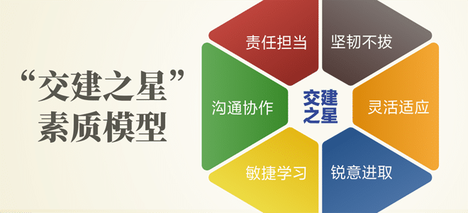 建立“交建之星”素質(zhì)模型(六有素質(zhì)、六色品格),即“責(zé)任擔(dān)當(dāng)”“溝通協(xié)作”“敏捷學(xué)習(xí)”“銳意進(jìn)取”“靈活適應(yīng)”“堅(jiān)韌不拔”等6個(gè)維度的勝任能力,打造公司校園人才通用標(biāo)準(zhǔn),用以輔助甄選與識(shí)別優(yōu)秀畢業(yè)生。