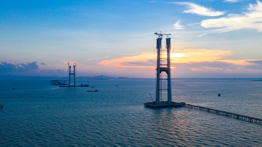 世界最大跨徑海上鋼箱梁懸索橋深中通道伶仃洋大橋,中交二航局自主研發建造一體化智能筑塔機,將超高混凝土橋塔的傳統建造技術升級為工業化建造技術,為超高索塔建造帶來革命性轉型升級。